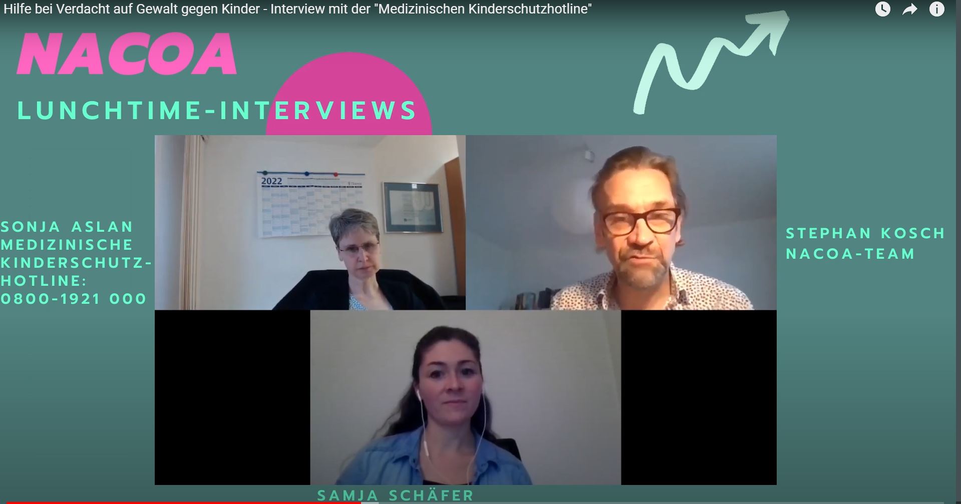 Stephan Kosch von NACOA Deutschland hat mit unserer Beraterin Sonja Aslan und unserer Sozialpädagogin Samja Schäfer ein Interview zum Thema "Hilfe bei Verdacht auf Gewalt gegen Kinder" geführt. Das Interview können Sie hier ansehen.
